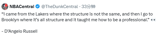 在节目上谈到了前东家湖人与篮网体系之间的差异;拉塞尔表示:我从湖人出身,那里的体系不太一样。后来我去了布鲁克林(篮网),那里的体系很严谨,那教会了我如何成为一名职业球员。